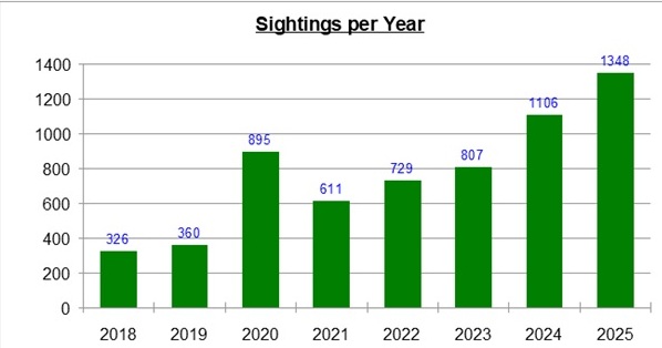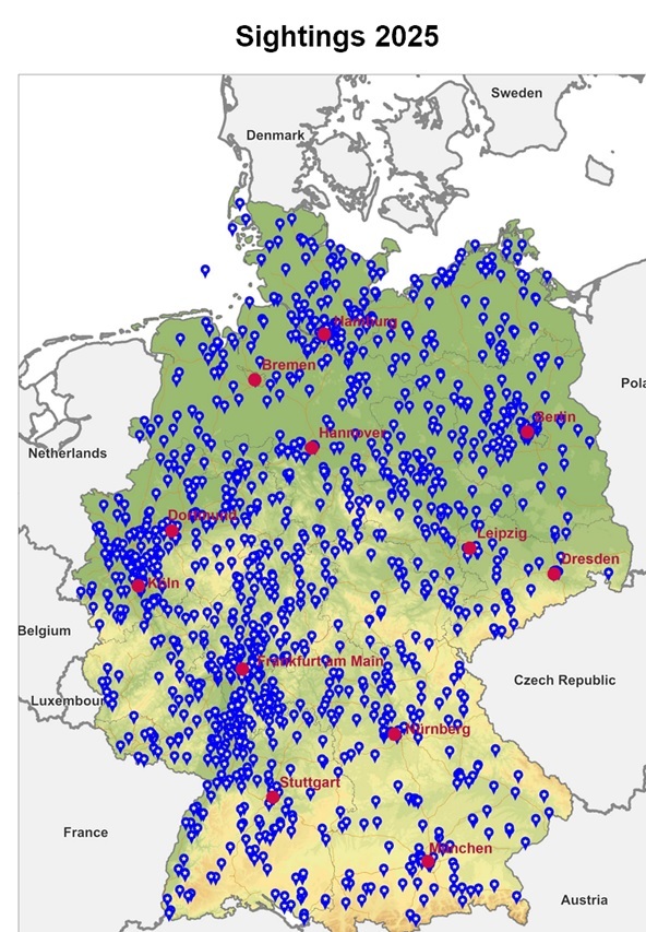 Come negli anni precedenti, è importante considerare i fattori contestuali che possono influenzare i livelli di segnalazione. Ad esempio, i Paesi Bassi segnalano le osservazioni esclusivamente tramite il sito web dell’unica organizzazione attualmente attiva nel paese. I Paesi Bassi hanno anche una delle più alte densità di popolazione dell’Europa occidentale, con oltre 500 persone per chilometro quadrato. In confronto, il Belgio ha 380, il Regno Unito 280, la Germania 240, l’Italia 200 e la Francia 120 persone per chilometro quadrato. Questi fattori, la densità di popolazione e l’organizzazione dei canali di segnalazione, contribuiscono certamente alle differenze osservate nel numero di segnalazioni tra i vari paesi.