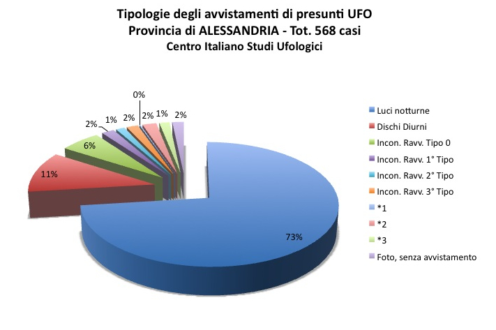 Il 73% dei casi alessandrini si riferisce alla categoria delle luci notturne. Solo l’11% riguarda oggetti lontani osservati di giorno, mentre un altro 11% sono i cosiddetti incontri ravvicinati, di cui nove del “terzo tipo”, ovvero con presenza di esseri umanoidi o entità animate.