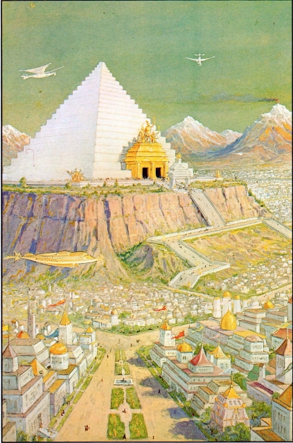 [L’illustrazione di questo articolo è tratta da “Secret Teaching of All Times”, uscito nel 1928. In esso l’esoterista canadese Manly P. Hall mostra il cielo dell’antica Atlantide popolato da ogni tipo di velivolo avanzato].